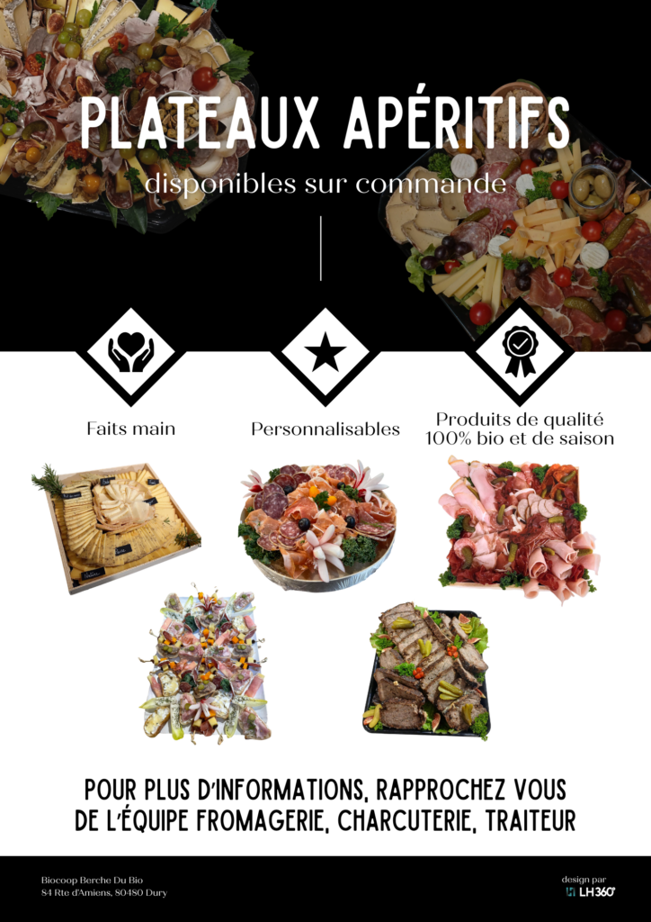 Dans le cadre de la mise en place d’un nouveau service de confection de plateaux apéritifs sur commande au magasin Biocoop d’Amiens Sud, l’équipe avait besoin d’un support de communication clair, attractif et efficace en point de vente.